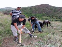 ERZURUM (İHA) - Oltu ilçesine bağlı Çamlıbel Köyü dikim sahasındaki fidanların ot temizliği yapılıyor. Oltu Orman İşletme Müdürlüğü tarafından 2011 yılında dikimi gerçekleştirilen fidanlar, dip kısımlarını saran yabancı otlardan temizleniyor. Çoğunluğunu gençlerin oluşturduğu çapa ekibi, fidanların diplerini çapa yardımıyla yabancı otlardan temizliyor.