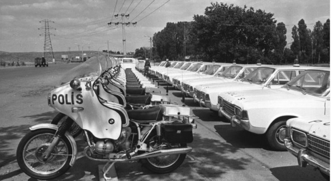 Ankara Emniyet Müdürlüğü'ne ait sosyal medya hesapları üzerinden, "1970’li yıllarda kullanılan araçlarımızdan bir kare" notuyla paylaşılan fotoğrafta döneme ait polis ekiplerince kullanılmakta olan motosiklet ve otomobiller yer aldı.