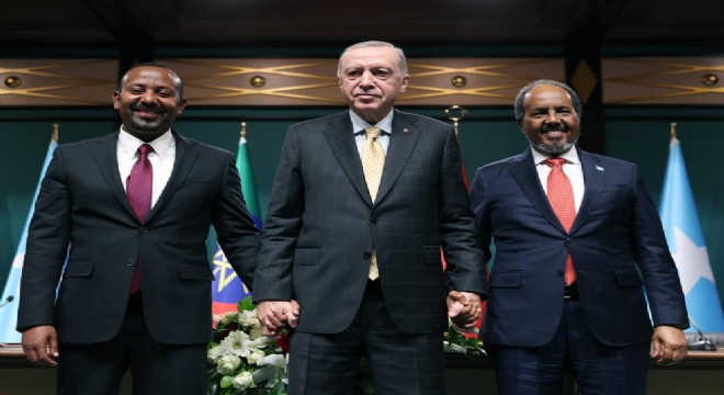 Cumhurbaşkanı Recep Tayyip Erdoğan, Somali Cumhurbaşkanı Hasan Şeyh Mahmud ve Etiyopya Başbakanı Abiy Ahmed ile Ortak Basın Toplantısı’nda konuştu. Etiyopya’nın ocak ayında Somaliland bölgesiyle bir mutabakat zaptı imzalamasının ardından ortaya çıkan kriz Cumhurbaşkanı Recep Tayyip Erdoğan'ın devreye girmesiyle çözüldü. Taraflar arasında Türkiye'nin arabuluculuk çabalarıyla 8 ay önce başlatılan süreç, Ankara'da Cumhurbaşkanı Erdoğan'ın başkanlığında gerçekleşen görüşmede barışla neticelendi.