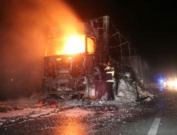 ERZİNCAN (İHA) - Erzincan’da seyir halindeyken fren balatalarının aşırı ısınması sonucu alev alan TIR’da yangın çıktı. İtfaiyenin müdahalesine rağmen araç kullanılamaz hale geldi.
