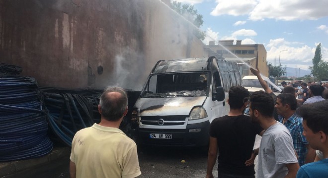 Edinilen bilgiye göre Erzincan Erzurum Karayolu üzerinde bulunan yeni sanayi sitesindeki plastik boruların bir arada bulunduğu alanda bilinmeyen bir nedenle yangın çıktı. Çıkan yangın büyüyerek yanı başında bulunan bir minibüse sıçradı.