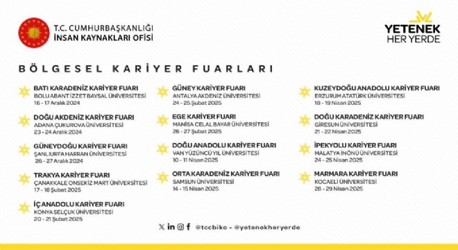 Genç yetenekler ile iş dünyası arasında güçlü bir köprü oluşturan ve Cumhurbaşkanlığı İnsan Kaynakları Ofisi'nin koordinasyonunda 2019 yılından beri düzenlenen Yetenek Her Yerde Bölgesel Kariyer Fuarları, 16 Aralık tarihinde Bolu’da yeniden başlıyor.