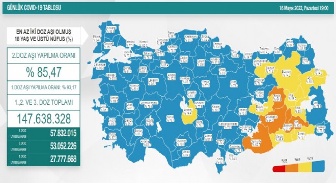 Sağlık Bakanlığı tarafından Türkiye'nin yeni korona virüs tablosu açıklandı. 16 Mayıs’ta açıklanan 24 saatlik verilere göre, bin 254 vaka tespit edildi. Virüs nedeniyle hayatını kaybedenlerin sayısı 4 oldu. Bir günde toplam 128 bin 957 test yapılırken, iyileşen hasta sayısı bin 358 olarak kaydedildi. Sağlık Bakanlığı tarafından açıklanan tabloda, 2 doz aşılama verilerine de yer verildi. En az 2 doz aşı olmuş 18 yaş üzeri nüfusu kapsayan verilere göre Türkiye'de 2. doz aşılama ortalama yüzde 85,47 oldu. 1. doz ortalaması yüzde 93,17 olurken, 1., 2. ve 3. doz aşısını olan vatandaş sayısı toplamda 147 milyon 638 bin 328’e yükseldi.