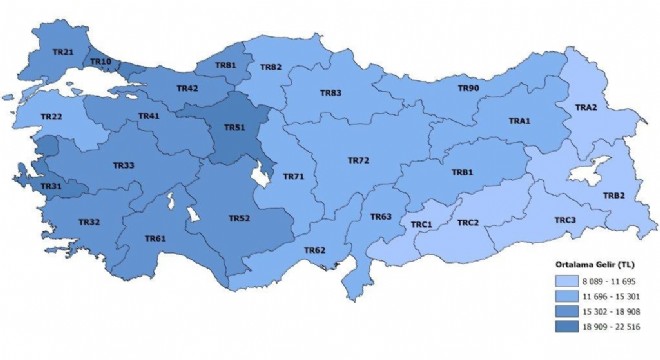 Ortalama yıllık eşdeğer hanehalkı kullanılabilir fert gelirinin en düşük olduğu bölgeler ise 8 bin 89 TL ile TRC2 (Şanlıurfa, Diyarbakır), 8 bin 184 TL ile TRC3 (Mardin, Batman, Şırnak, Siirt) ve 8 bin 773 TL ile TRB2 (Van, Muş, Bitlis, Hakkari) şeklinde sıralandı.