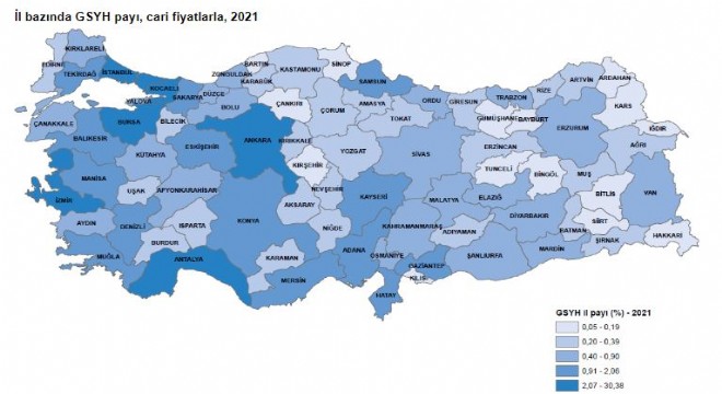 Türkiye İstatistik Kurumu (TÜİK), 2021 yılı İl Bazında Gayrisafi Yurtiçi Hasıla verisini açıkladı. Buna göre, il düzeyinde cari fiyatlarla GSYH hesaplamalarına göre; 2021 yılında İstanbul 2 trilyon 202 milyar 156 milyon TL ile en yüksek GSYH'ye ulaştı ve toplam GSYH'den yüzde 30,4 pay aldı. İstanbul'u, 667 milyar 142 milyon TL ve yüzde 9,2 pay ile Ankara, 462 milyar 152 milyon TL ve yüzde 6,4 pay ile İzmir izledi. İl düzeyinde GSYH hesaplarında son üç sırada 6 milyar 99 milyon TL ile Tunceli, 4 milyar 968 milyon TL ile Ardahan ve 3 milyar 861 milyon TL ile Bayburt yer aldı.
