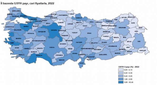 Gayrisafi Yurt İçi Hasıladan (GSYH) en yüksek payı yüzde 30,4 ile İstanbul aldı. İl düzeyinde cari fiyatlarla GSYH hesaplamalarına göre; 2022 yılında İstanbul 4 trilyon 564 milyar 280 milyon TL ile en yüksek GSYH'ye ulaştı ve toplam GSYH'den yüzde 30,4 pay aldı. İstanbul'u, 1 trilyon 329 milyar 810 milyon TL ve yüzde 8,9 pay ile Ankara, 972 milyar 238 milyon TL ve yüzde 6,5 pay ile İzmir izledi. İl düzeyinde GSYH hesaplarında son üç sırada 11 milyar 288 milyon TL ile Tunceli, 10 milyar 539 milyon TL ile Ardahan ve 8 milyar 287 milyon TL ile Bayburt yer aldı.