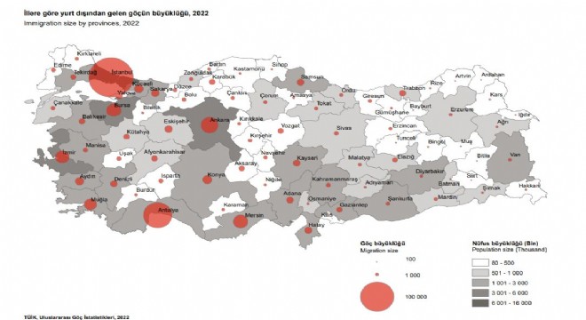 Türkiye İstatistik Kurumu (TÜİK), 2022 yılı Uluslararası Göç İstatistikleri’ni açıkladı. Buna göre, yurt dışından Türkiye'ye göç edenlerin sayısı 2022 yılında, bir önceki yıla göre yüzde 33,2 azalarak 494 bin 52 kişi oldu. Göç eden nüfusun yüzde 52,9'unu erkekler, yüzde 47,1'ini ise kadınlar oluşturdu. Yurt dışından gelen nüfusun 94 bin 409'unu Türk vatandaşları, 399 bin 643'ünü ise yabancı uyruklular oluşturdu.