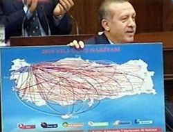 Başbakan Recep Tayyip Erdoğan, partisinin grup toplantısında yaptığı konuşma sırasında bölünmüş yollarla ilgili haritayı milletvekillerine gösterdi.