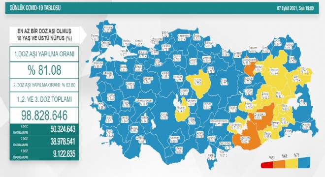 7 Eylül Salı günü yayımlanan Kırmızı, turuncu, sarı ve mavi kategorilerle ifade edilen toplam nüfus içinde aşı oranı son haritasında Doğu Anadolu Bölgesinde mavi kategoriye giren il sayısı 7’ye çıktı. Erzurum, Elazığ, Iğdır, Ağrı, Bingöl, Muş Bitlis, sarı; Erzincan, Ardahan, Kars, Van, Hakkari, Malatya ve Tunceli mavi kategoride yer aldı. Bölgede turuncu kategoride yer alan il kalmadı.