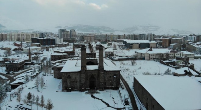Karı ve soğuğu ile meşhur olan Erzurum’da bir yanda kışın çetin şartları yüzünü göstermeye başlarken, bir yandan da görsel anlamda güzellikler yaşanıyor. Yaklaşık altı ayı kış şartları altında geçen Erzurum’da her kar yağışı sonrası ortaya çıkan karlı manzaralar ise seyir keyfi veriyor. Başta Çifte Minareli Medrese, Erzurum Kalesi, Üç Kümbetler, Lala Mustafa Paşa Cami ve Yakutiye Medresesi olmak üzere onlarca tarihi eseri içinde barındıran Erzurum’da havadan çekilen görüntüler adeta mest etti. Vatandaşlar da bir yandan kışın zorlukları ve soğuğu ile baş etmeye çalışırken, bir yandan da karla gelen beyaz güzellikleri yaşıyor.