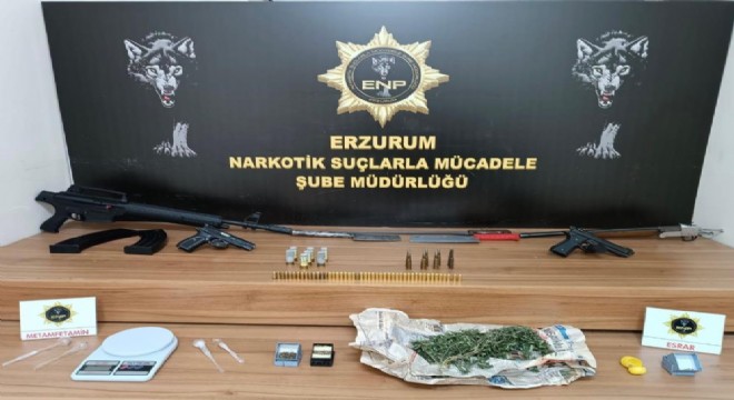Ekipler tarafından şahsa ait yerde yapılan aramalarda, 50.28 gram esrar, 7.69 gram kenevir tohumu, 1 adet hassas terazi, 4 adet içerisinde metamfetamin kırıntıları bulunan uyuşturucu madde kullanmaya yarayan aparat, 2 adet ruhsatsız tabanca, 2 adet tüfek, 47 adet 9 mm fişek, 8 adet 7.62 mm fişek, 7 adet av tüfeği fişeği, 3 adet bıçak (sallama ve satır) ele geçirildi.