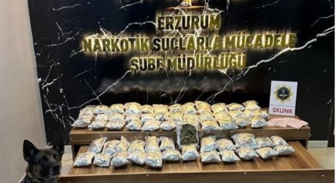 Erzurum Emniyet Müdürlüğü Narkotik Suçlarla Mücadele Şube Müdürlüğü ekipleri tarafından yapılan operasyonda Narkotik Arama Köpeği Su 6 kilo 975 gram skunk maddesi yakaladı.