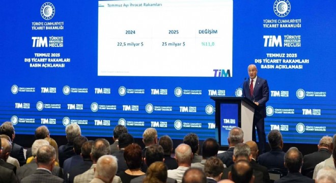 Bakan Ömer Bolat, 2025 Temmuz ayıyla birlikte tüm zamanların en yüksek mal ihracatı rekorunun kırıldığını belirterek, "Bir ayda ulaşılan en büyük ihracat hacmi 25 milyar dolar oldu. Geçen yıl temmuz ayında bu rakam 22,5 milyar dolardı. Bu da demek oluyor ki 2,5 milyar dolarlık ek ihracat gerçekleştirilmiş oldu. Bu artış oranı yüzde 11'e denk geliyor. Söz konusu 2,5 milyar dolarlık artış, son 1 yıllık toplam ihracatımıza da aynı oranda katkı sağladı. Haziran ayı ise Kurban Bayramı nedeniyle 20,5 milyar dolar seviyesinde kalmıştı. Dolayısıyla bir önceki aya kıyasla 4,5 milyar dolarlık bir yükseliş söz konusu" diye konuştu.