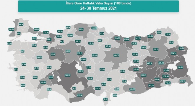 Sağlık Bakanı Fahrettin Koca, 24 - 30 Temmuz illere göre her 100 bin kişide görülen Covid-19 vaka sayılarını açıkladı. Buna göre Erzurum’da her 100 bin kişide haftalık vaka sayısı 151,13 olarak kaydedildi. Erzurum Türkiye illeri sıralamasında her yüz binde görülen vaka sayısı yüksekliği bakımından 32’inci, bölgede ise 9’uncu sırada yer aldı.