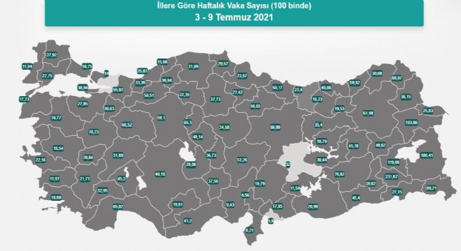 Sağlık Bakanı Fahrettin Koca, 3-9 Temmuz illere göre haftalık vaka sayısını açıkladı. İstanbul'da haftalık vaka sayısı 100 bin kişide 56,75, Ankara 59,1, İzmir 22,16 vaka tespit edildi.