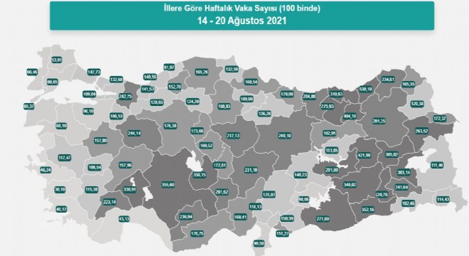 14 – 20 Ağustos iller her yüz binde görülen vaka sayısı dağılım sıralaması şöyle: