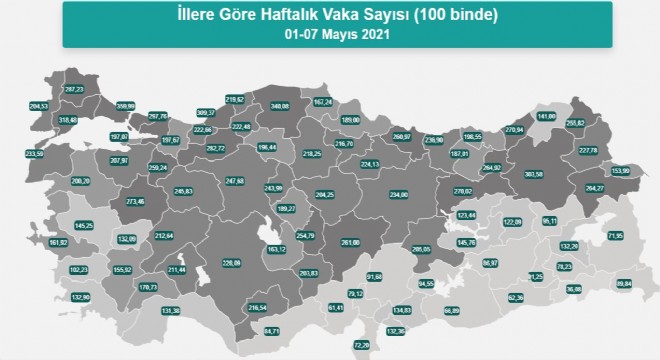 Sağlık Bakanlığı iller bazlı her yüz binde haftalık vaka sayılarını açıkladı. Vaka sayısı dağılımı şöyle: İstanbul 359,99, Kastamonu 340,08, Tekirdağ 318,48, Zonguldak 309,37, Erzurum 303,58, Kocaeli 297,76, Kırklareli 287,23, Bolu 282,72, Kütahya 273,46, Rize 270,94, Erzincan 270,02, Bayburt 264,92, Ağrı 264,27, Kayseri 261, Ordu 260,97, Bilecik 259,24, Ardahan 255,82, Nevşehir 254,79, Ankara 247,68, Eskişehir 245,83, Kırıkkale 243,99, Giresun 236,9, Sivas 234, Çanakkale 233,59, Konya 228,09, Kars 227,78, Tokat 224,13, Düzce 222,66, Karabük 222,48, Bartın 219,62, Çorum 218,25, Amasya 216,7, Karaman 216,54, Afyon 212,64, Isparta 211,44, Bursa 207,97, Malatya 205,05, Edirne 204,53, Yozgat    204,25, Niğde 203,83, Balıkesir 200,2, Trabzon 198,55, Sakarya 197,67, Yalova   197,07, Çankırı  196,44, Kırşehir 189,27, Samsun 189, Gümüşhane 187,01, Burdur 170,73, Sinop 167,24, Aksaray 163,12, İzmir 161,92, Denizli 155,92, Iğdır 153,99, Elazığ 145,76, Manisa 145,25, Artvin 141, Gaziantep 134,83, Muğla 132,9, Kilis 132,36, Bitlis 132,2, Uşak 132,09, Antalya 131,38, Tunceli 123,44, Bingöl 122,09, Aydın 102,23, Muş 95,11, Adıyaman 94,55, Kahramanmaraş 91,68, Batman 91,25, Hakkari 89,84, Diyarbakır 86,97, Mersin  84,71, Osmaniye 79,12, Siirt 78,23, Hatay 72,2, Van 71,95, Şanlıurfa 66,89, Mardin 62,36, Adana 61,41, Şırnak 36,08