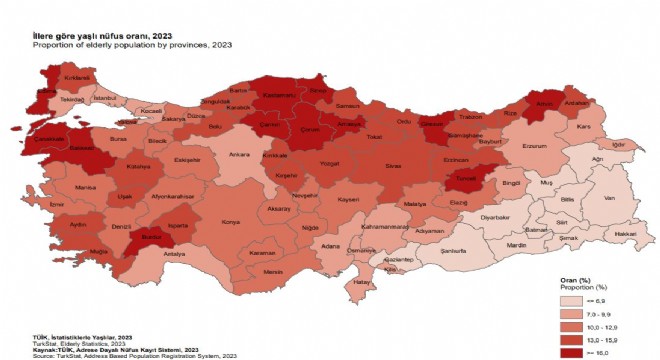 Türkiye’de yaşlı nüfus oranının en düşük olduğu 25 il; Şırnak, Hakkari, Şanlıurfa, Van, Batman, Diyarbakır, Siirt, Ağrı, Mardin, Gaziantep, Bitlis, Muş, Iğdır, İstanbul, Kilis, Bingöl, Kocaeli, Hatay, Adıyaman, Kars, Kahramanmaraş, Osmaniye, Adana, Erzurum, Antalya olarak açıklandı.