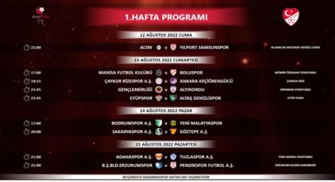 2022-2023 sezonu 12 Ağustos Cuma günü oynanacak Altay-Yılport Samsunspor maçı ile açılacak. Stadyumunda bakım onarım çalışmaları devam eden Bodrumspor, Pendikspor, Sakaryaspor ve Tuzlaspor kulüplerimizin stat bilgileri boş bırakılmış olup, ilgili müsabakaların hangi statlarda oynanacağı daha sonra ilan edilecek.