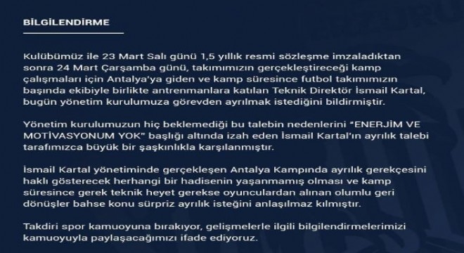 "Kulübümüz ile 23 Mart Salı günü 1.5 yıllık resmi sözleşme imzaladıktan sonra 24 Mart Çarşamba günü, takımımızın gerçekleştireceği kamp çalışmaları için Antalya’ya giden ve kamp süresince futbol takımımızın başında ekibiyle birlikte antrenmanlara katılan Teknik Direktör İsmail Kartal, yönetim kurulumuza görevden ayrılmak istediğini bildirmiştir. Yönetim kurulumuzun hiç beklemediği bu talebin nedenlerini 'Enerjim ve motivasyonum yok' başlığı altında izah eden İsmail Kartal’ın ayrılık talebi tarafımızca büyük bir şaşkınlıkla karşılanmıştır. İsmail Kartal yönetiminde gerçekleşen Antalya Kampında ayrılık gerekçesini haklı gösterecek herhangi bir hadisenin yaşanmamış olması ve kamp süresince gerek teknik heyet gerekse oyunculardan alınan olumlu geri dönüşler bahse konu sürpriz ayrılık isteğini anlaşılmaz kılmıştır. Takdiri spor kamuoyuna bırakıyor, gelişmelerle ilgili bilgilendirmelerimizi kamuoyuyla paylaşacağımızı ifade ediyoruz."