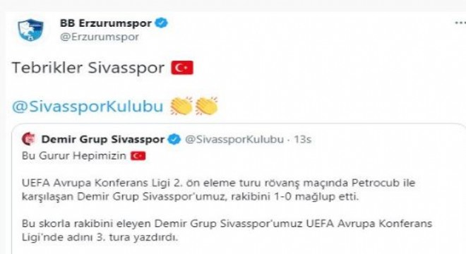 İlk olarak Çaykur Rizespor sosyal medya hesabından, “Tebrikler Sivasspor Kulübü. Çaykur Rizespor olarak, UEFA Konferans Ligi 2. Ön Eleme Turu rövanş maçında Moldova ekibi FC Petrocub Hincesti'yi mağlup ederek bir üst tura çıkan Demir Grup Sivasspor’u tebrik ediyoruz” ifadeleri kullanıldı.