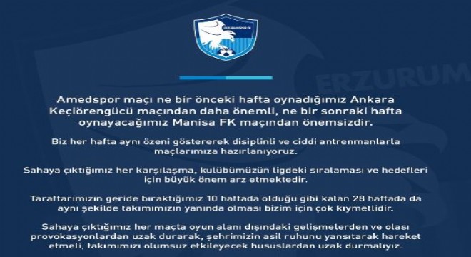 Amedspor maçı ne bir önceki hafta oynadığımız Keçiörengücü maçından daha önemli, ne bir sonraki hafta oynayacağımız Manisa FK maçından önemsizdir. Biz her hafta aynı özeni göstererek disiplinli ve ciddi antrenmanla maçlarımıza hazırlanıyoruz. Sahaya çıktığımız her karşılaşma kulübümüzün ligdeki sıralaması ve hedefleri için büyük önem arzetmektedir. Taraftarımızın geride bıraktığımız 10 haftada olduğu gibi kalan 28 haftada da aynı şekilde takımımızın yanında olması bizim için çok kıymetlidir. Sahaya çıktığımız her maçta oyun alanı dışındaki gelişmelerden ve olası provokasyonlardan uzak durarak şehrimizin asil ruhunu yansıtarak hareket etmeli, takımımızı olumsuz etkileyecek hususlardan uzak durmalıyız, Bu konuda taraftarımızın bugüne kadar olduğu gibi bugünden sonra da sağduyulu davranacağından şüphemiz olmadığı gibi camiamıza zarar verecek hususlar karşısında bilinçli hareket edeceklerine inancımız tamdır. Büyük Erzurumspor taraftarımıza saygılarımızla. ‘