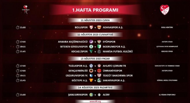 Trendyol 1. Lig'de 2023-2024 sezonunda ilk 5 haftanın programı açıklandı.