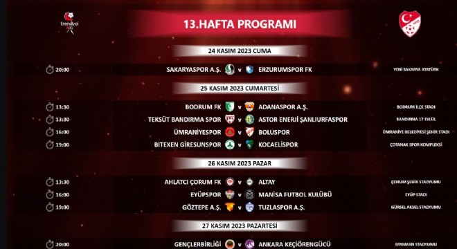 Erzurumspor 13 -17’inci hafta periyodunda Deplasmanda Sakaryaspor, Çorumspor ve Eyüpspor ile karşılaşırken, evinde Gençlerbirliği ve Ümraniyespor ile puan mücadelesi verecek. Mavi Beyazlı ekip 24 Kasım’da çıkacağı deplasmanda Sakaryaspor ile saat 20.00’de karşılaşacak.