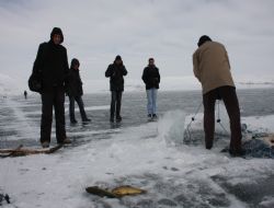 BİTLİS (İHA) - Şiddetli soğuklar yüzünden tamamen donan göldeki balıkçıların eskimo usulü zorlu yaşamı büyük ilgi görüyor. Birçok fotoğrafçı, balıkçıların bu zorlu yaşamlarını belgelemek için donan göle akın etti.