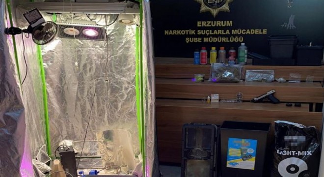 Erzurum Cumhuriyet Başsavcılığı koordinesinde Narkotik Suçlarla Mücadele Şube Müdürlüğünce yasa dışı kenevir yetiştiriciliğine yönelik eş zamanlı operasyon düzenlendi. Operasyonda 2 şahıs yakalanırken, 1 şahsın ikametin de yapılan aramada 1 adet uyuşturucu imalat düzeneği, 1 adet hint keneviri kökü bulunan ekili saksı, 3 adet boş saksı, 1 adet uyuşturucu madde öğütücü, 1 adet naylon torba içerisinde bitki toprağı, 1 adet uyuşturucu kullanmaya yarayan aparat, 7 adet zirai sıvı, 1 adet kuru sıkı tabanca, 80,8 gram skunk ele geçirildi.