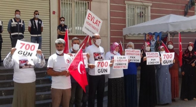 Çocukları terör örgütü PKK tarafından zorla dağa kaçırıldığı iddiasıyla HDP Diyarbakır İl Başkanlığı binası önünde oturma eylemi yapan ailelerin evlat nöbeti 700'üncü güne ulaşırken, aileler HDP il binası önünde ellerinde bayraklarla basın açıklaması yaptı.