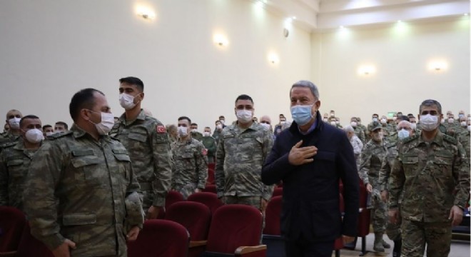 "Azerbaycan'ın Karabağ’daki işgal edilmiş topraklarını kurtararak şanlı bir zaferle sonuçlanan haklı mücadelesine milletçe verdiğimiz desteğimizin önemli katkıları olmuştur. Türkiye, Azerbaycan ve Rusya arasında yapılan mutabakat doğrultusunda bölgede barış, huzur ve istikrarın tesisi için kurulan Ortak Merkez'in faaliyete başlaması için koordinasyonlar devam etmektedir. Türkiye ve Azerbaycan 'iki devlet, tek millet' anlayışı ile kederde ve kıvançta bir ve beraberdir. Türkiye bugüne kadar olduğu gibi bundan sonra da tüm imkânlarıyla Azerbaycanlı kardeşlerimizin yanında olacaktır. Tüm bu faaliyetlerin yanı sıra korona virüs ile mücadelemizi de ilk günden itibaren taviz vermeden sürdürmekteyiz. Korona virüs ile mücadelede dünya orduları içinde en başarılı ordulardan biri olan Türk Silahlı Kuvvetleri, aldığımız etkili tedbirlerle operasyon bölgelerinde, gemilerde, filolarda görev ve sorumluluklarını hiçbir aksaklığa meydan vermeden başarı ile yerine getirmektedir."