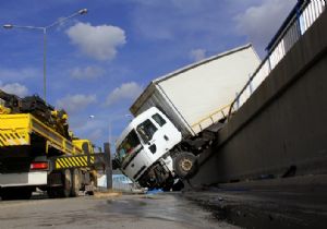 Erzurum'da freni boşalan TIR, önüne kattığı araçları sürükleyerek köprüden aşağı uçtu. TIR'ın yarısı köprü korkuluklarında asılı kaldı.