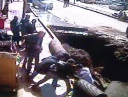 Çevredekilerin yardımı sonucunda son anda suyla dolu çukura düşmekten kurtarılan 3 kişi, olayın etkisiyle olay yerinden hızla uzaklaşırken, kaza anı, işyerinin yakınında bulunan güvenlik kamerası tarafından saniye saniye kaydedildi.