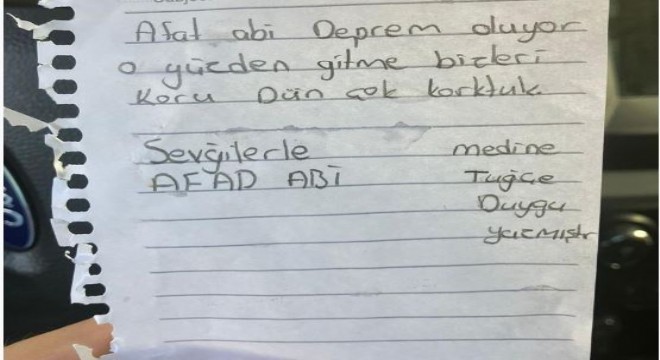 Yumrukaya köyündeki çalışmalarını tamamlayan AFAD ekipleri, dönüş yoluna geçerken araç camına bırakılan bir not fark etti. Medine, Tuğçe ve Duygu isimlerinin yazdığı notta, “AFAD abi, deprem oluyor. Bu yüzden gitme, bizleri koru. Dün çok korktuk. Sevgilerle AFAD abi” ifadelerine yer verildi.