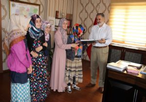 Hocaları Ela Aydın ile birlikte İl Müftümüz Hasan Çınar'ı makamında ziyaret eden öğrencilere görme engellilere yönelik kabartmalı Kur'an-ı Kerim hediye edildi.