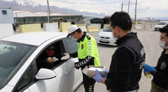 Erzurum ve Sivas istikametinden gelen araçları uygulama noktalarında durduran güvenlik güçleri hem denetim yaptı hem de kolonya ikramında bulunarak maske dağıttı.