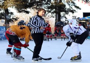 Erzurum Gençlik ve Spor İl Müdürlüğü tarafından organize edilen buz hokeyi maçları Havuzbaşı’ndaki süs havuzunda oynandı.