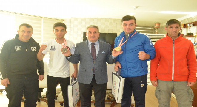 Erzurum Gençlik ve Spor İl Müdürü Fuat Taşkesenligil, Türkiye şampiyonu boksör Muhammet Aydın ile üçüncü olan Yusuf Yılmaz’ı kutladı. Şampiyon boksörleri ödüllendiren Taşkesenligil, sporda gelen başarıların kendilerini gururlandırdığını söyledi.