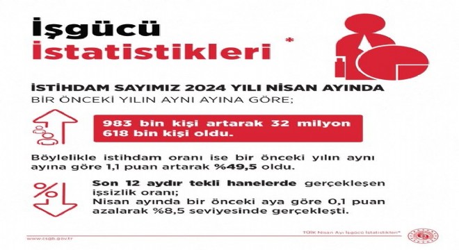 Işıkhan, son 12 aydır tekli hanelerde gerçekleşen işsizlik oranının, bir önceki aya göre 0,1 puan azalış ile yüzde 8,5 seviyesinde gerçekleştiğini belirterek, “İşsiz sayısı bir önceki aya göre 18 bin kişi, bir önceki yılın aynı ayına göre ise 484 bin kişi azaldı. İstihdamı destekleyen politikalarımızın sonuçlarını her geçen gün daha iyi şekilde görmeye devam ediyoruz. İstihdam sayımız 2024 yılı Nisan ayında; bir önceki yılın aynı ayına göre 983 bin artarak 32 milyon 618 bin kişi, istihdam oranı ise 1,1 puan artarak yüzde 49,5 oldu” ifadelerine yer verdi.