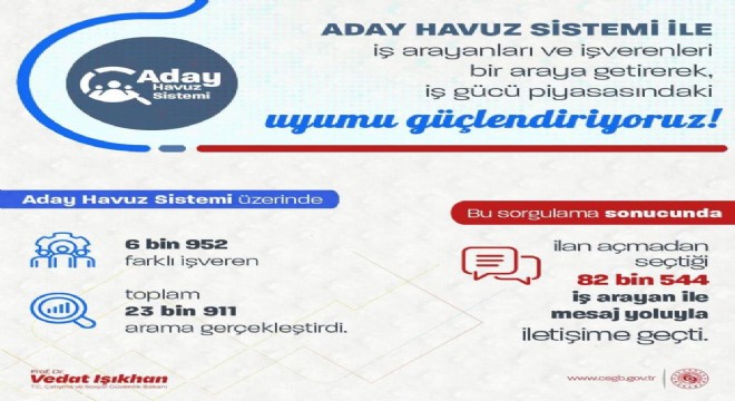 “Geçtiğimiz yılın Eylül ayında hayata geçirdiğimiz Aday Havuz Sistemimiz ile iş arayan vatandaşlarımızın istihdam fırsatlarına kolay erişebilmelerini sağlıyor, işverenlerin ise ihtiyaç duyduğu nitelikli adaylara hızlıca ulaşabilmelerine imkan sunuyoruz. Aday Havuz Sistemi sayesinde 6 bin 952 farklı işveren toplam 23 bin 911 arama gerçekleştirdi. Bu sorgulamalar sonucunda 82 bin 544 iş arayan vatandaşımız ile iletişime geçildi. İstihdamı destekleyici uygulamalarımız ile iş gücü piyasasını daha verimli hale getirmeye devam edeceğiz.”