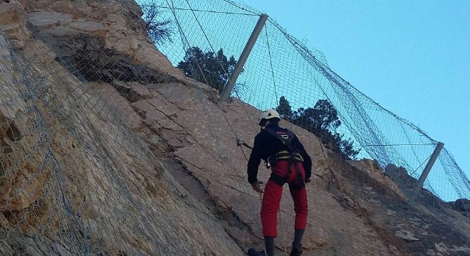 Karayolu'ndaki heyelan tehlikesi bulunan dik yamaçların hakim olduğu bölge tel örtü ağlarla kaplanıyor. İspir - Yusufeli yolunda korku dolu anlar yaşatan, şiddetli yağmur ve fırtınalı günlerde kaya parçalarının döküldüğü kayalık bölge, tel örgü ağlarla çevriliyor. Dağcıların çalıştığı tel örgü çalışmalarında güvenlik önlemleri alınarak tel örgülerin çekileceği dik yamaca tırmanılıyor. Metrelerce yükseklikte, tel örgü ağlarını birleştiren dağcılar, yamacı santim santim korumaya alarak düşme olasılığı olan kayalara güvenlik koridoru içine alıyor.