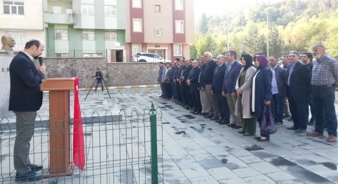 İspir Meydanında Atatürk Anıtına çelenk sunumu yapan muhtarlar saygı duruşunda bulundu İstiklal Marşı’nı okudu.
