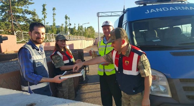 Palandöken İlçesinde jandarma ekipleri, trafik denetimi kapsamında durdurdukları sürücülerin Ramazan Bayramını kutlayarak, şeker ve kolonya ikram etti.