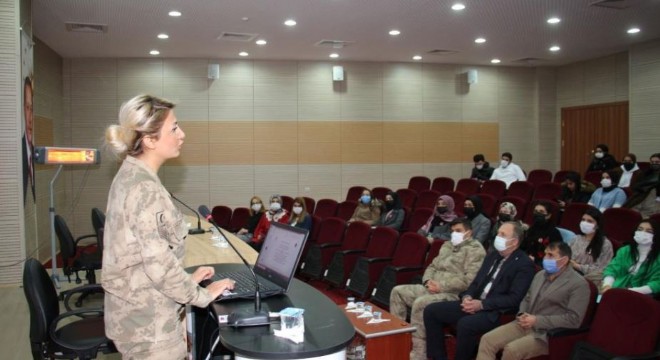 Erzurum İl Jandarma personelinden Jandarma Astsubay Üst Çavuş KADES uzmanı Tuğba Güven, Jandarma Astsubay Kıdemli Çavuş Ayşe Ağdağ ve Uzman Jandarma Kıdemli Çavuş Hamit Kılıç, Oltu Beşeri ve Sosyal Bilimler Fakültesi öğrencilerine bilgi verildiler.