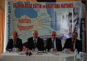 Bilgilendirme toplantısında konuşan Prof. Dr. Fazlı Erdoğan, Erzurum’un çevre bir çok ile hizmet veren sağlık bölge merkezi olduğunu ifade ederek sözlerine şöyle devam etti. “Ardahan, Kars, Ağrı, Iğdır, Muş, Bingöl, Erzincan, Artvin olmak üzere bizim hem merkezde hem de bağlı ilçelerimizde oldukça yaygın sağlık hizmeti alan bir merkezi pozisyondayız. Bizim genel sekreterliğimize bağlı 13 tane devlet, 1 tane araştırma hastanemiz ve 1 tane de ağız ve diş sağlığı merkezimiz var. Türkiye’de kamu hastaneler birliklerinde bazı değişikler oldu ama biz Erzurum’da hiçbir değişiklik olmadı. Bunun bir anlamı da şu ki ürettiğimiz hizmetten üst irade memnun ki değişmediler. Çünkü biliyorsunuz bizler sözleşmeli personeliz bizim karnelerimiz var. Verdiğimiz hizmetler yeterli seviyeye çıkmadıysa karne notunun altında kaldıysa kimsenin eşi dostu olduğu için değil sadece bu gerekçeye bağlı olarak siz üretmeniz gerek hizmetin şu noktada altında kaldınız deyip rahatlıkla görevden alabiliyorlar. Erzurum Kamu Hastaneler Birliği personelimize baktığımızda sadece bölge hastanemizde 11 doçent ve profesör olan eğitim görevlimiz var. 2 tane başasistanımız olmak üzere toplamda 314 uzman hekimimiz var. Birlik personellerimize baktığımızda 19 asistan hekimimiz, 108 pratisyen hekim, 82 diş hekimi, bin 976 yardımcı sağlık personeli, 917 diğer personel olmak üzere birlik toplamında 3 bin 429 personelimiz bulunmaktadır.”