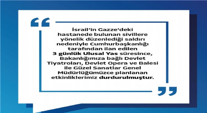 Kültür ve Turizm Bakanlığı, Gazze’deki sivillere yönelik düzenlenen saldırı nedeniyle Cumhurbaşkanlığı tarafından ilan edilecek olan 3 günlük ulusal yasa ilişkin açıklama yaptı. Bakanlık tarafından yapılan yazılı açıklamada, “İsrail’in Gazze'deki hastanede bulunan sivillere yönelik düzenlediği saldırı nedeniyle Cumhurbaşkanlığı tarafından ilan edilen 3 günlük Ulusal Yas süresince, Bakanlığımıza bağlı Devlet Tiyatroları, Devlet Opera ve Balesi ile Güzel Sanatlar Genel Müdürlüğümüzce planlanan etkinliklerimiz durdurulmuştur” denildi.
