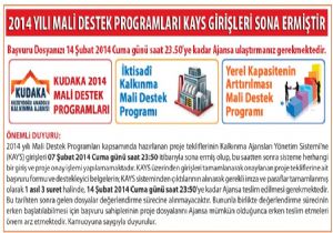 2014 yılı Mali Destek Programları kapsamında hazırlanan proje tekliflerinin Kalkınma Ajansları Yönetim Sistemi’ne (KAYS) girişlerinin 7 Şubat 2014 Cuma günü saat 23.50 itibarıyla sona erdiği, bu saatten sonra sisteme herhangi bir giriş ve proje onay işlemi yapılamadığı belirtildi.
