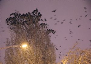ERZURUM (İHA) - Erzurum’da yoğun kar yağışı gece saatlerinde de devam ederken yerlerde konacak yer bulmakta zorlanan kargalar da ağaçları mesken tuttu.