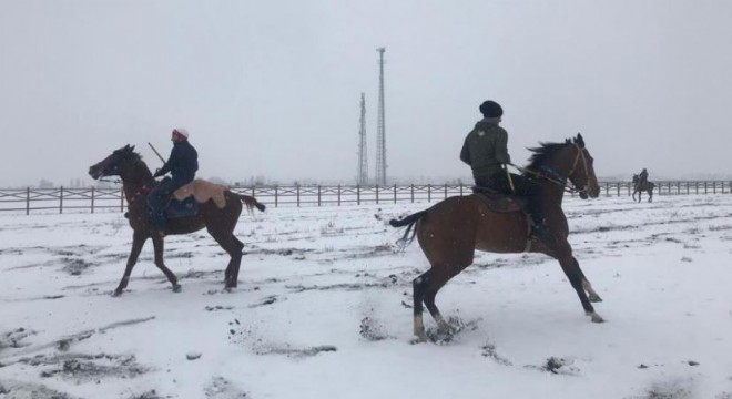 Kar yağışı altında düzenlenen cirit gösterisi vatandaşları heyecanlı anlar yaşattı. Cirit müsabakası berabere sonuçlanırken, kazanan ise dostluk oldu.